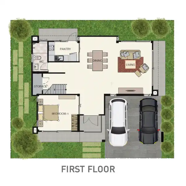 ถนนในโครงการกว้าง และมีพื้นที่สีเขียวหน้าบ้านให้ทุกหลัง